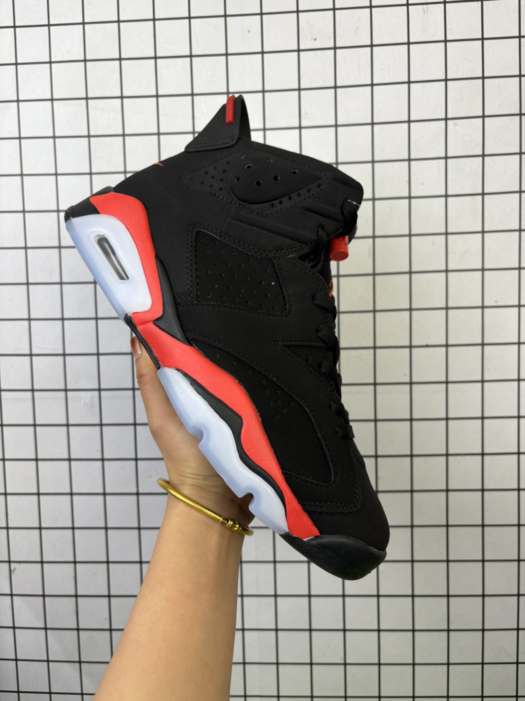 公司级 Air Jordan 6 Retro OG "Reverse Infrared" 高帮 复刻黑红 3M反光 AJ6 乔丹6代 aj6 乔6 高邦 反转红外线 男女同款 乔丹篮球鞋系列 采用甲壳式鞋身的设计,线条十分简洁明快,精巧的造型强化了鞋身的包裏性,鞋舌上创新性添加了的两个方洞,鞋舌上Jumpman Logo采用红色刺绣呈现,后跟以元年红色Nike Swooshh Logos刺绣点缀,中底部分将黑、红区域反转呈现,相比于初代配色更加吸睛;更利于调整位置与方便穿脱犹如跑车后扰流板的鞋跟拉环,以及脚踝外侧的醒目凸起,营造出前卫时尚的视觉冲击.鞋身下部则依旧延续了性能不俗的分离式Air Sole气垫与水晶半透明橡胶大底,材质以黑色牛巴戈材质鞋面搭配3M反光细节,辅以冰蓝色水晶底收尾;中底红色也相较于上次的粉红更容易让人接受,视觉表现更富张力. 货号:CT8529-001(2026版) 编码719 air_jordan