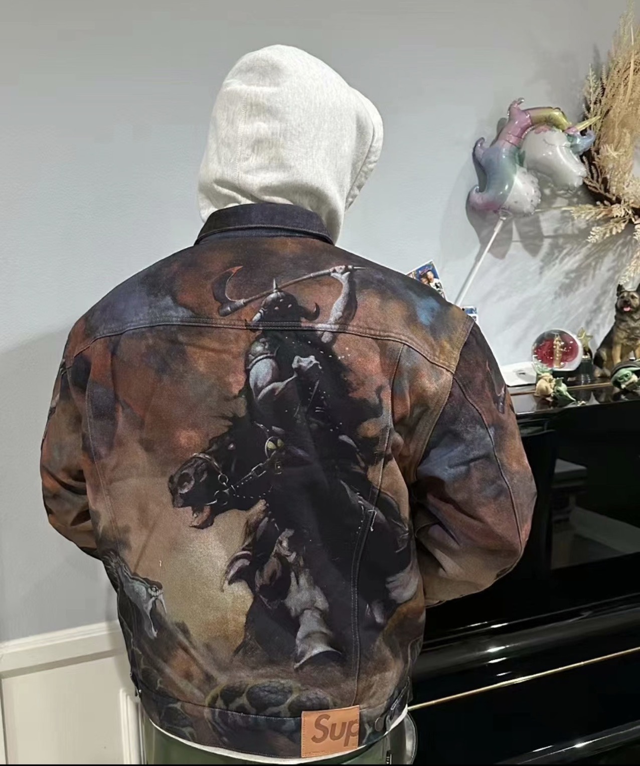 Supreme x Frank Frazetta 联名款 FW24 WEEK15 Faux Shearling Lined Trucker Jacket 骑士斩蛇单宁夹克厚外套 上身效果#